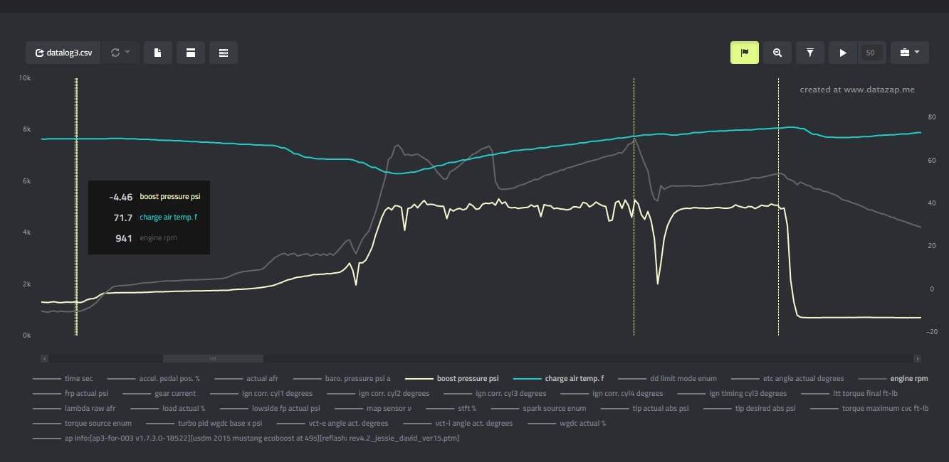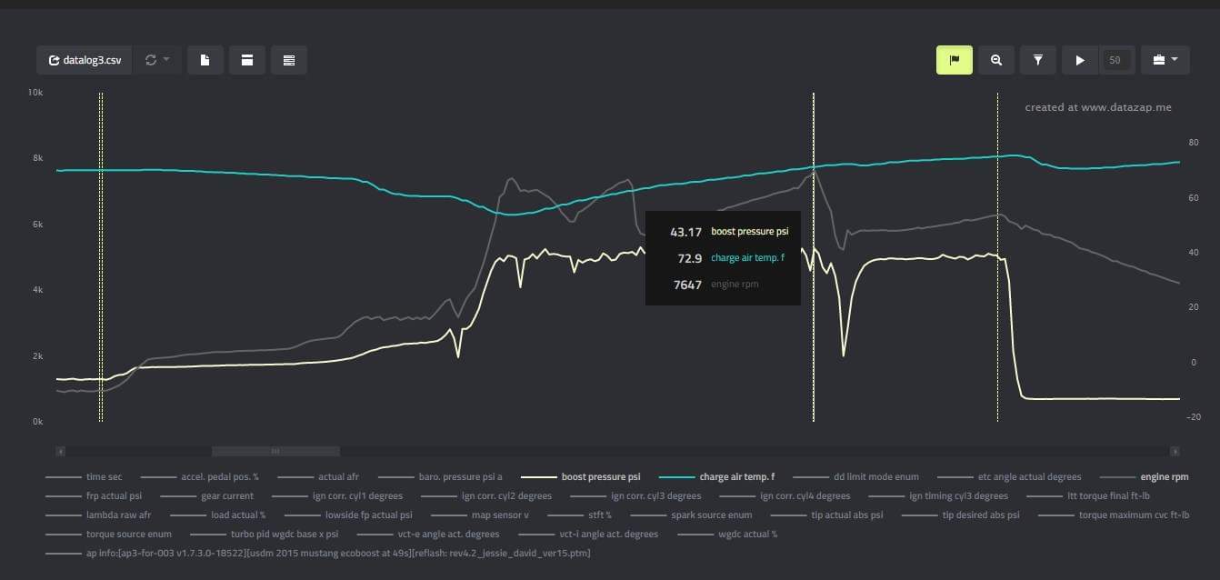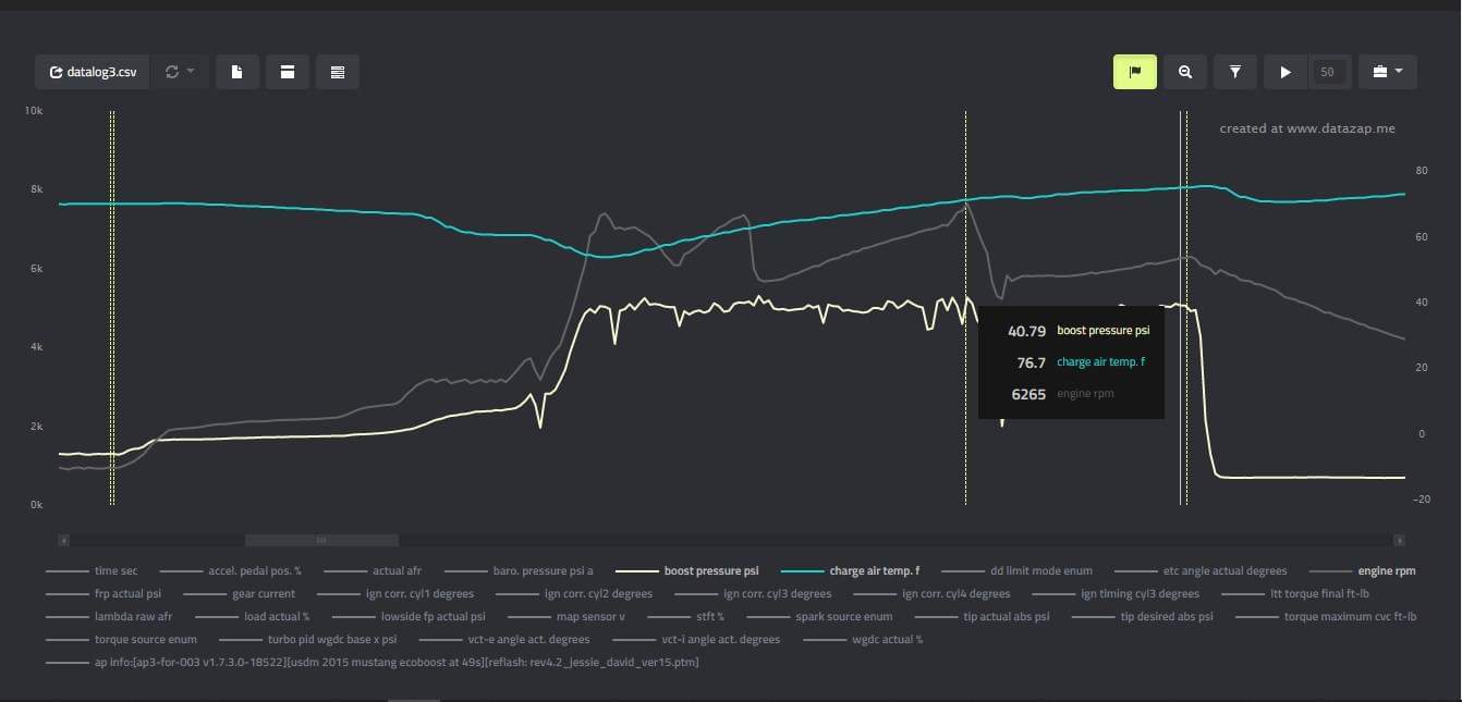 The CVF Race Intercooler for 2015-2023 Ford Mustang EcoBoost is a direct fit replacement that is over 200% larger than the stock unit, featuring a core size of 21″ x 15″ x 4″. As the charts above indicate, during independent testing we’ve observed a reduction of 92 degrees in Charge Air Temperature where it matters: on the street, and not at the dyno (the same vehicle under similar conditions).