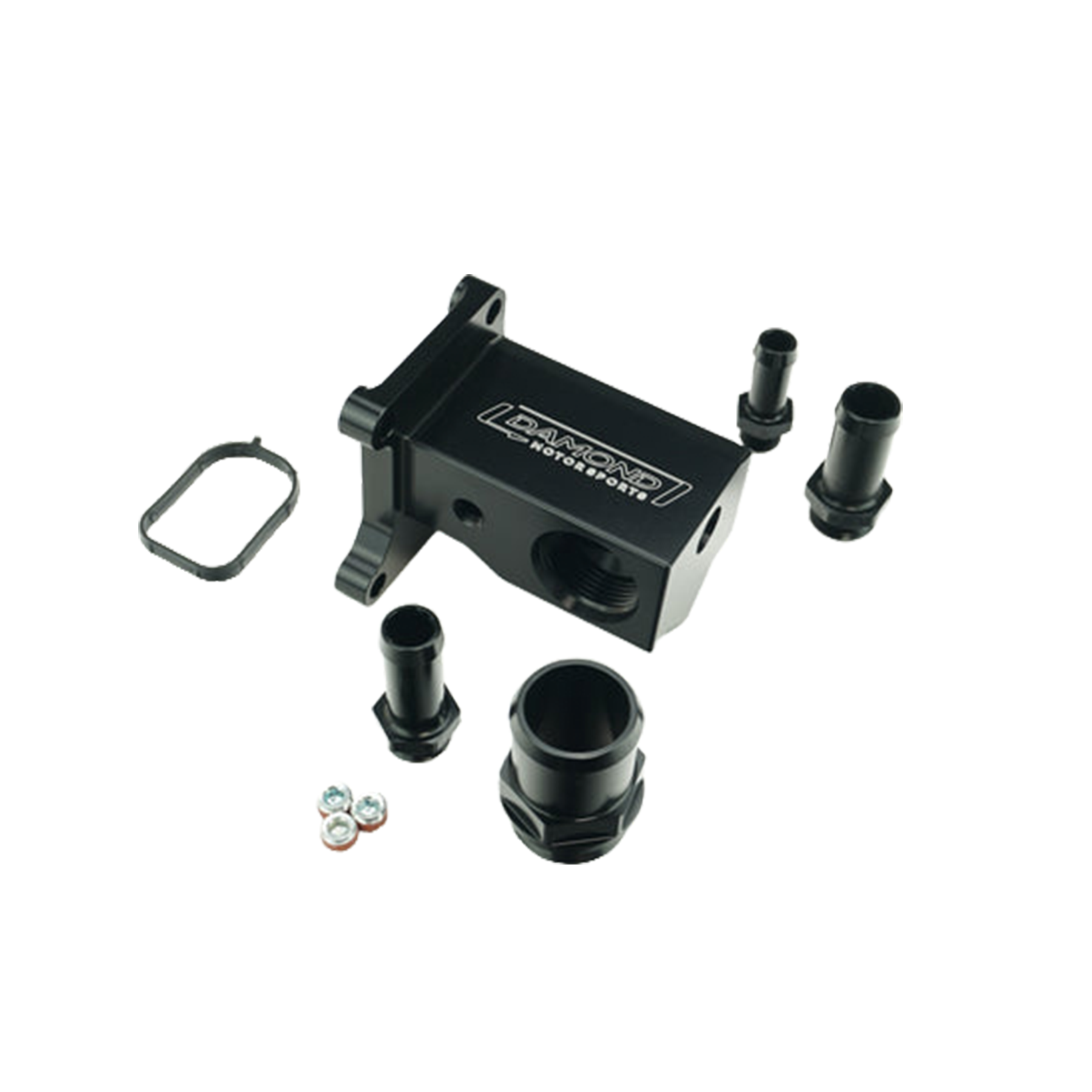 The Damond Motorsports Focus ST and Focus RS Water Outlet Manifold is the perfect addition for serious racers and enthusiasts wanting to replace the factory plastic unit and clean up their engine bay. Machined out of 6061 aluminum and anodized black, this billet piece is designed to last compared to the original plastic piece. Our Water Outlet Manifold also features additional ports for adding in sensors of your choosing, and allows you to plug ports you don’t need in racing applications, such as the heater core and thermostat bypass. All of the main hose and fitting connections are o-ring bosses, allowing for this to be converted to all AN style fittings.