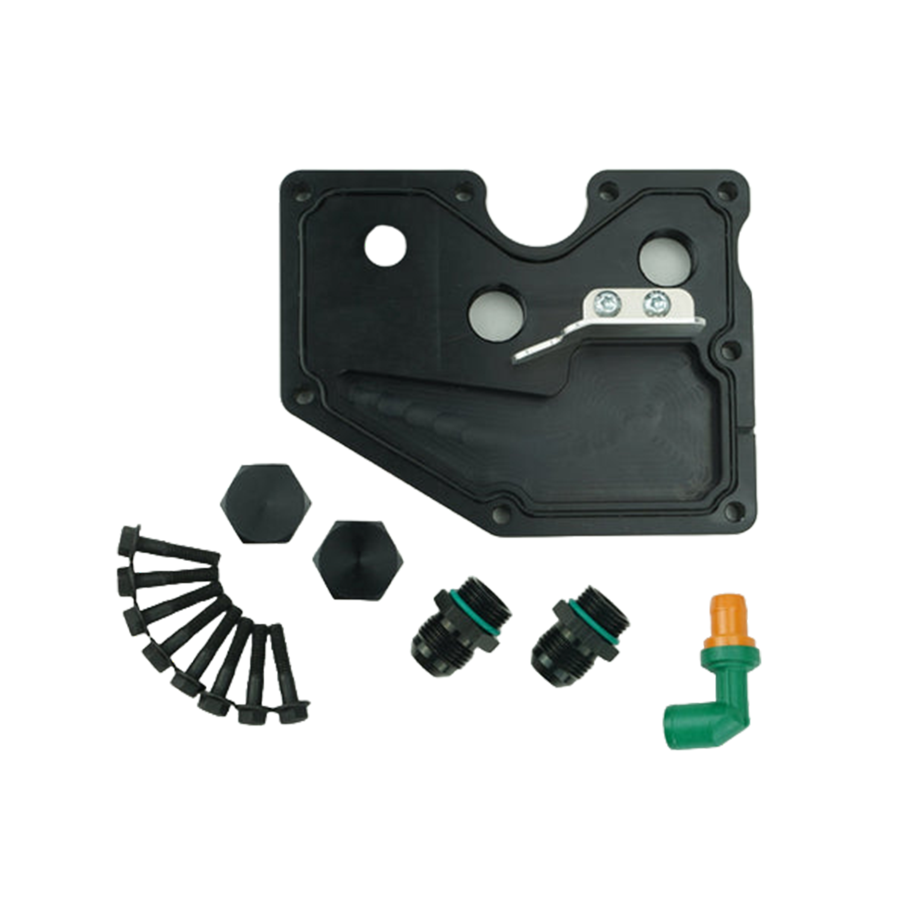 The PCV plate is a fully machined replacement of the factory PCV oil separator plate, with a port machined to accept an OEM Ford PCV valve and o-ring, as well as two additional large -10 ports, thus allowing you to run a variety of PCV and OCC set-ups. With this latest version we have added a baffle plate to help reduce the amount of blow-by out of the PCV plate.