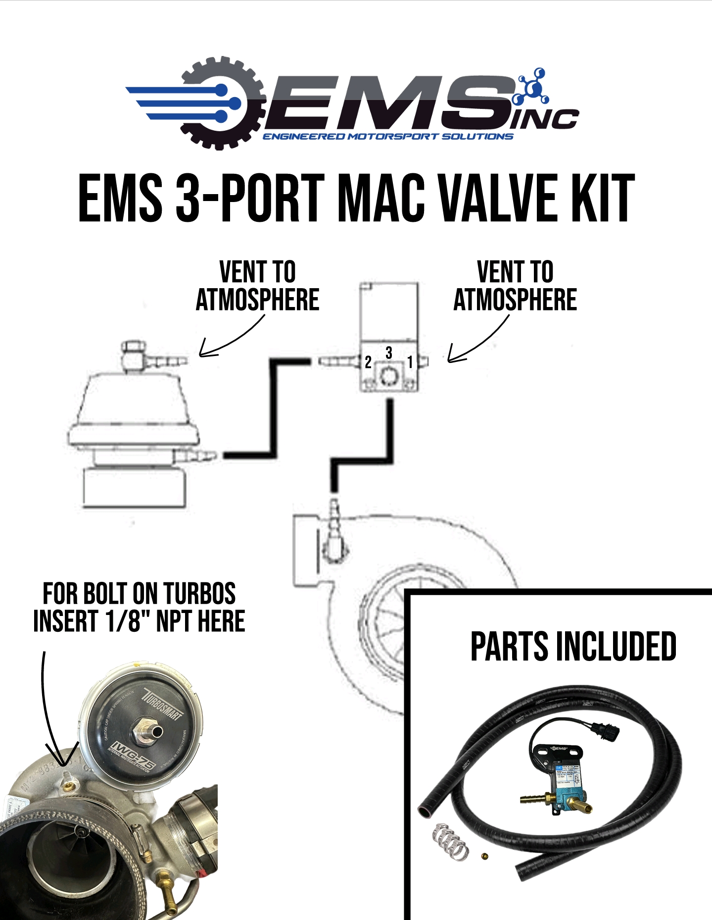 The EMS 3-Port MAC Valve Kit is designed to improve boost control on the Ford Focus RS 2.3L EcoBoost, especially vehicles running upgraded turbochargers or high-boost tuning setups.