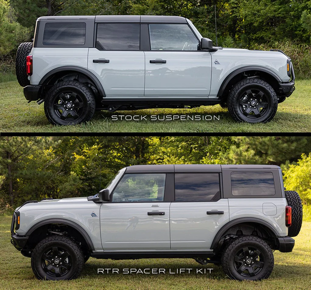 RTR Modern Aggressive Styling and Tactical PerformanceThe RTR Billet Spacer Lift will give your Bronco up to a 2″ height, depending on model and configuration of an individual vehicle. This increase allows you to run up to a 35″ tire while minimizing added weight thanks to its Billet Machined 6061-T6 Aluminum construction.The angled design of the lift spacers are designed to work in concert with Ford’s design to avoid overstressing the upper and lower strut mounts.